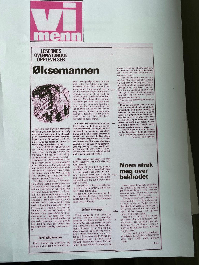 Først mange år etter dette falt det meg i tankene at far, som den gang vare en robust og uredd kar i sine beste år, kanskje likevel var smittet av uhyggen omkring denne øksemann-historien, og at han følte en slags trygghet ved å ha meg ved siden i senga.