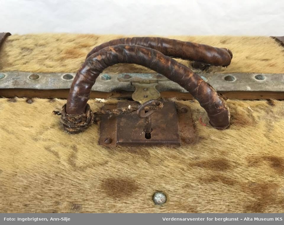 Kofferten er avlang og avrundet med hengslet skilleplate. Kofferten er kantet med lær som er naglet fast. De fleste av naglene er irret. På hver side av håndtakene er det smale lærstropper med spenner. Håndtakene består av tvunnet tau trukket med lær.»