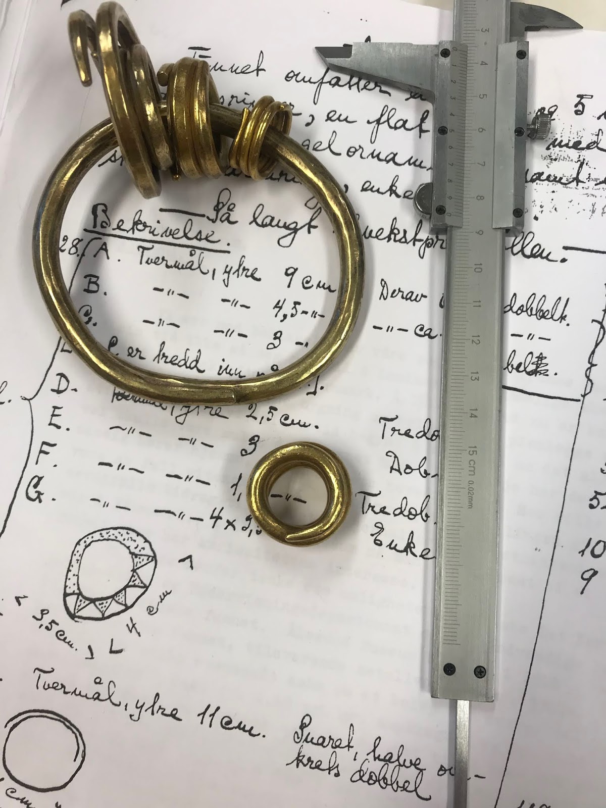 De seks gullringene er i utgangspunktet nokså uproblematiske – det ser ut til å dreie seg om såkalte «betalingsringer» som vanligvis dateres til sen folkevandringstid, helst til 500-tallet. Dette er en vanlig gjenstandstype, og mange av skattefunnene fra folkevandringstid inneholder slike ringer. De er trolig fremstilt av omsmeltet romersk mynt, er gjerne av standardisert vekt, og kan ha vært brukt som betalingsmiddel i forbindelse med bøter osv. Men gullskatter fra folkevandringstid er svært sjeldne i Nord-Norge, og det nærmeste sikre og bevarte skattefunnet i nord er gjort helt nede i Vefsn. Fra samisk område, som Laksefjord var for 1500 år siden som i mellomkrigsårene, kjenner vi ingenting tilsvarende.